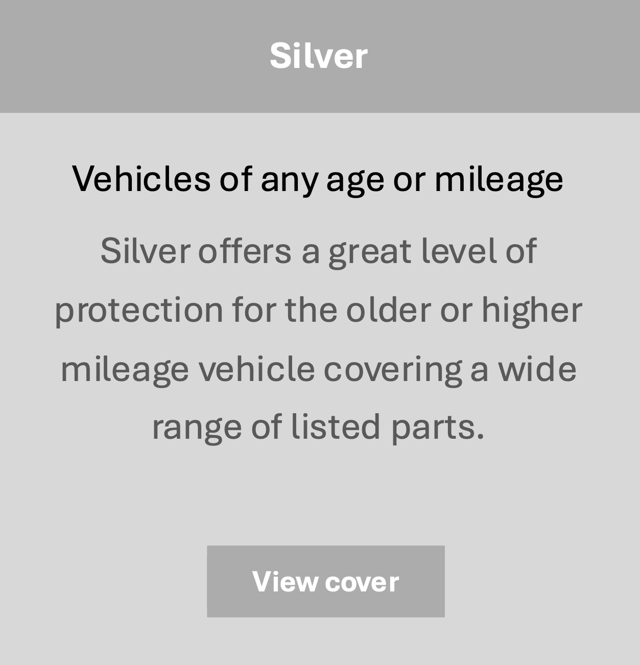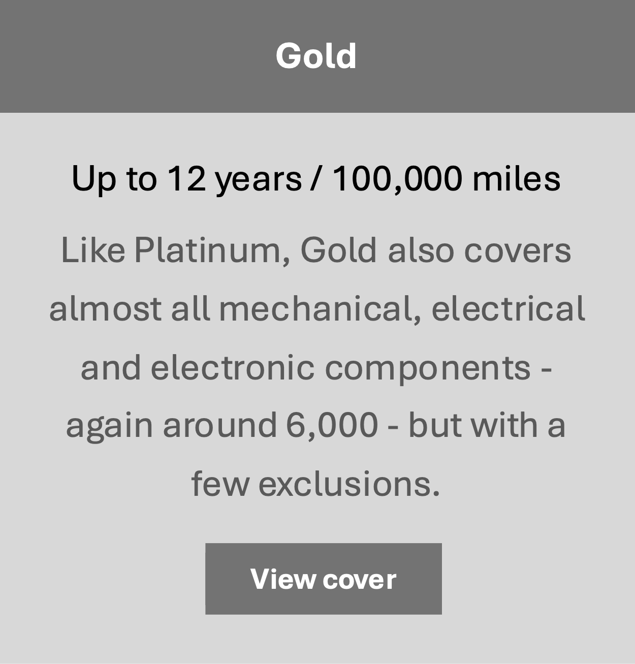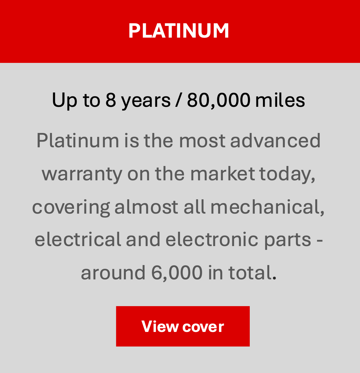 Platinum and Gold both cover around 6,000 mechanical, electrical and electronic components including many that are normally excluded by other warranty companies. Silver covers a range of listed items and is designed with the older or higher mileage vehicle in mind.